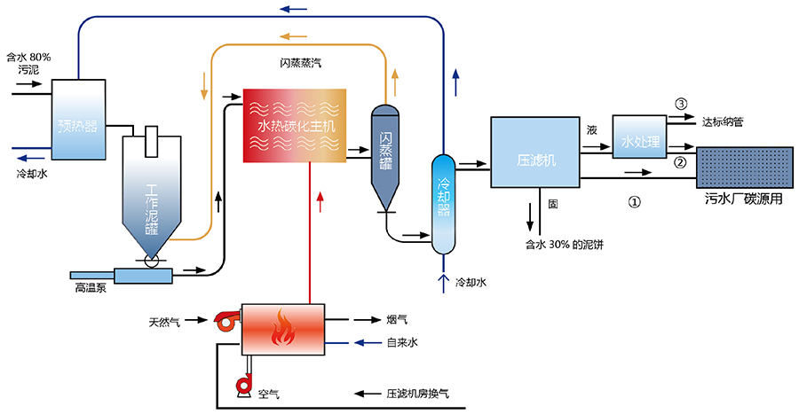 污水處理污泥通過離心機脫水至80%左右,匯集到收池中,池底污泥泵將污泥送至相應的污泥儲存罐中(儲存罐容積大小暫定100m³)再由污泥儲存罐底部的泵送至熱回收泥罐,污泥在熱回收泥罐中(0.6Mpa)被蒸汽余熱加熱到70℃,再由雙缸連續式柱塞泵送入水熱炭化系統,水熱炭化系統設定環境壓力2.0Mpa,溫度200℃以上,污泥在水熱炭化系統中整體停留時間40分鐘左右,并發生了炭化反應,污泥中大部分有機質被炭化分解,炭化反應完成后的污泥經過閃蒸罐與蒸汽進行分離,分離后的蒸汽(140℃)經由管道送回至工作泥罐中將污泥進行預熱。從閃蒸罐分離出來的漿狀污泥再經由間接式水換熱器進行降溫至60℃以下后送至熱解罐等待壓濾,熱解罐底泥漿泵將污泥漿送至相應的壓濾機進行固液分離,分離后得到含水率30%以下固體物送至原料存儲區,并根據實際情況送至終端用戶;整個處理過程不產生臭氣,僅有部分不凝氣和板框壓濾廢氣,不需要獨立設置臭氣處理系統,分離后的水匯入廠區污水處理廠深度處理。